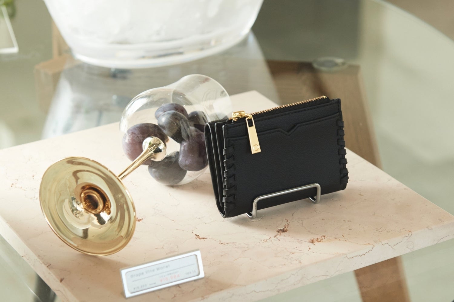 「Grape Vine Wallet」は、大人気バッグ「Grape Vine Tote Bag」に続く2つ目のグレープレザー製アイテム。高級感のあるグレープレザーの質感とブドウの蔓をイメージしたかがり縫いのデザインが特徴です。