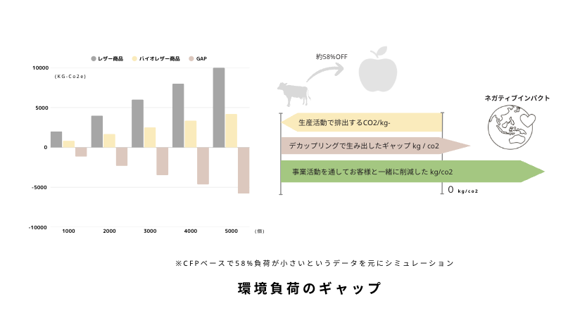 消費を維持しながら環境負荷を切り離していくというデカップリングの概念を参考に、動物由来のレザー製品と植物原料を含むバイオレザー製品の環境負荷の差をCFP(カーボンフットプリント)を元に算出し、その販売数量からくるギャップを私たちの事業活動由来のインパクトとしてれポーティングを実施しています。